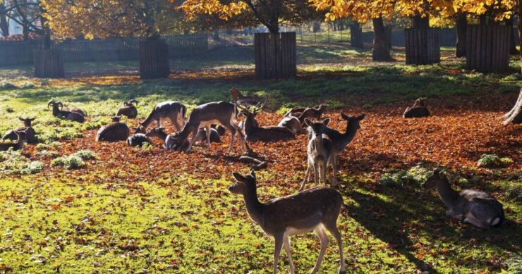 Deer roam freely in an enclosed area, giving the park its name and unique charm.
